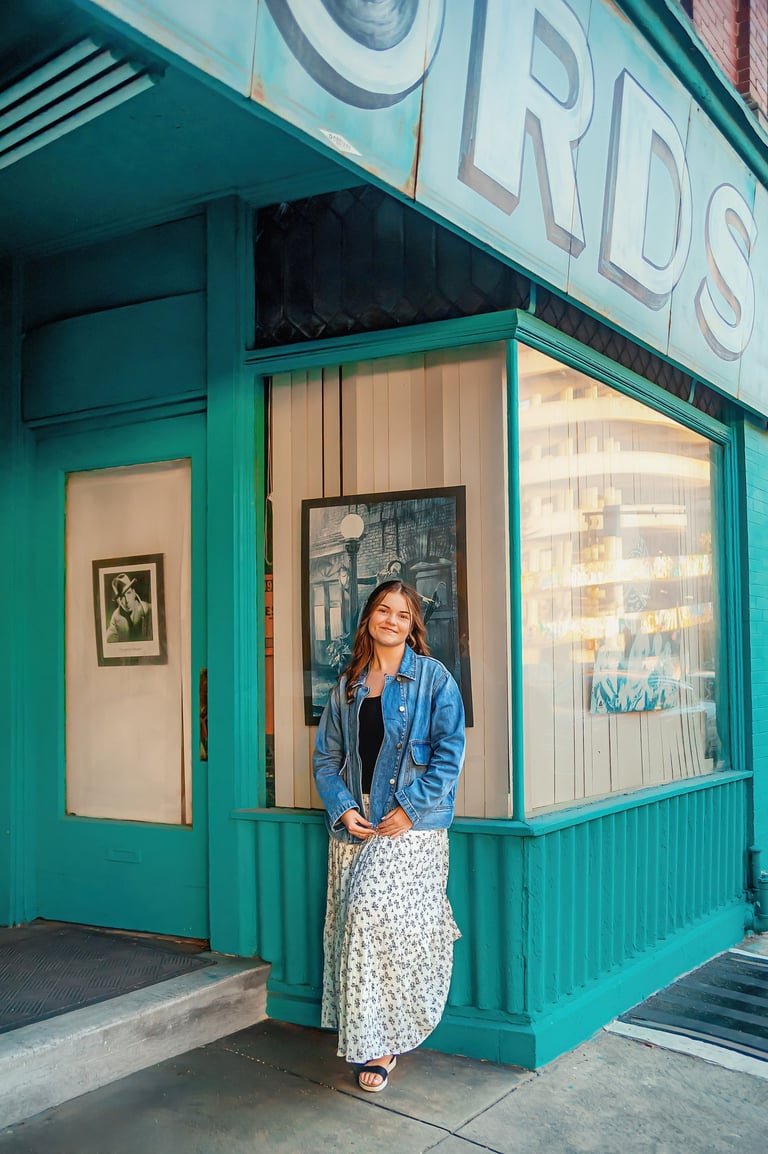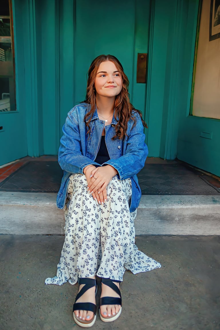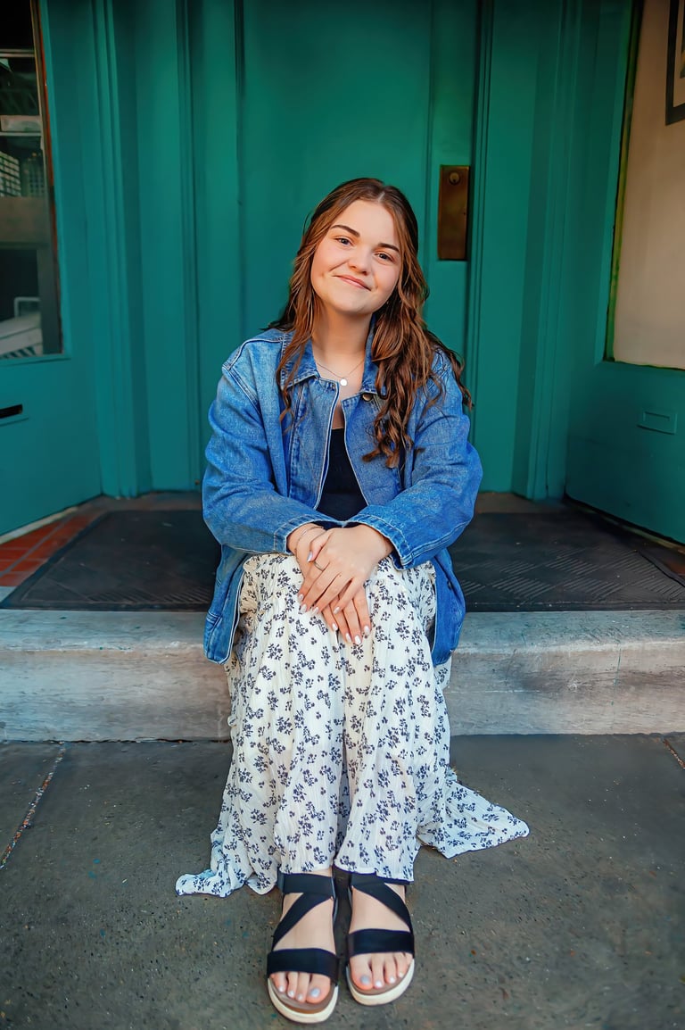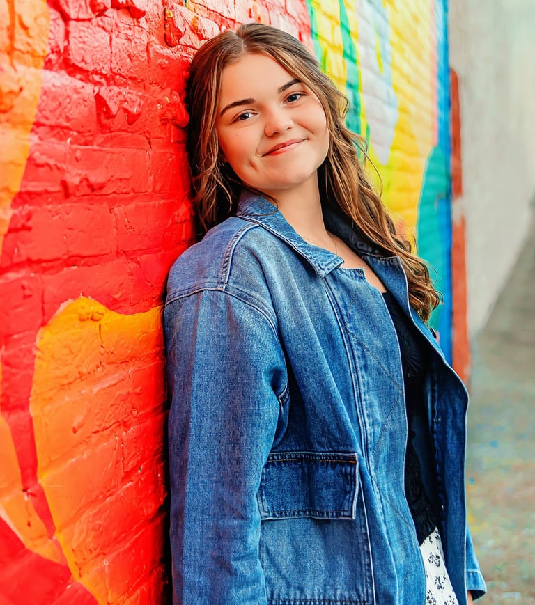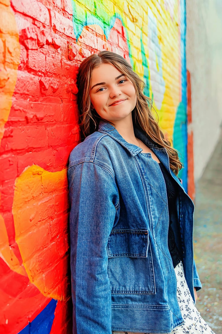 Fall senior pictures in downtown Lancaster with Class of 2026 senior rep Arabella. Her colorful, creative session captured city charm and her vibrant personality.